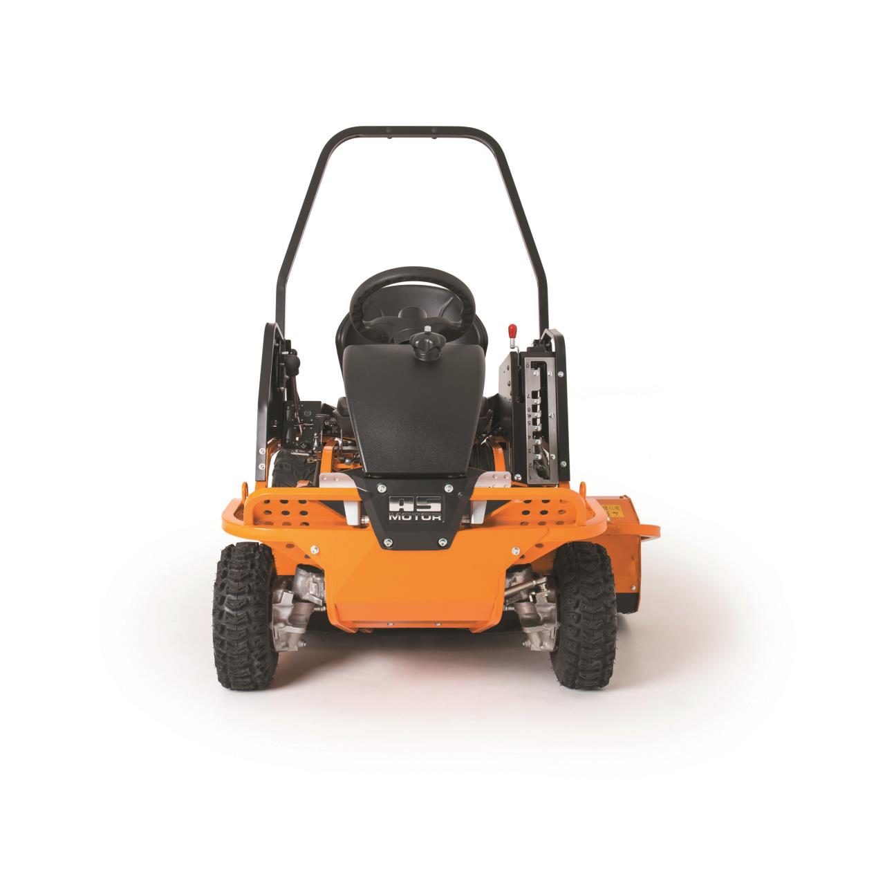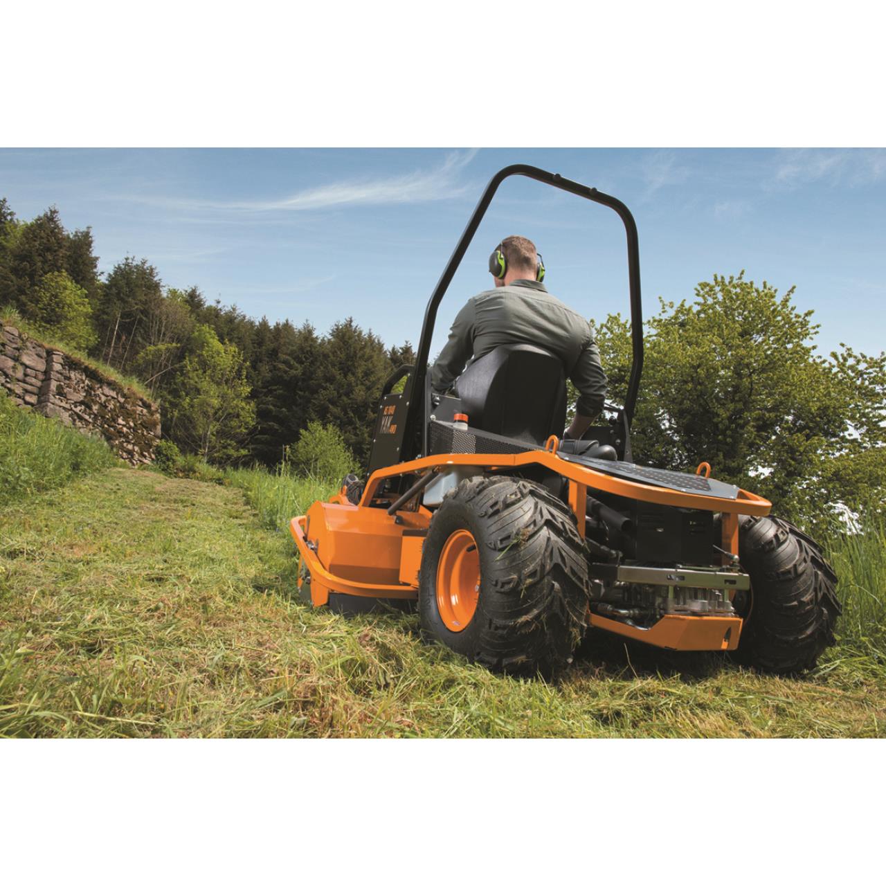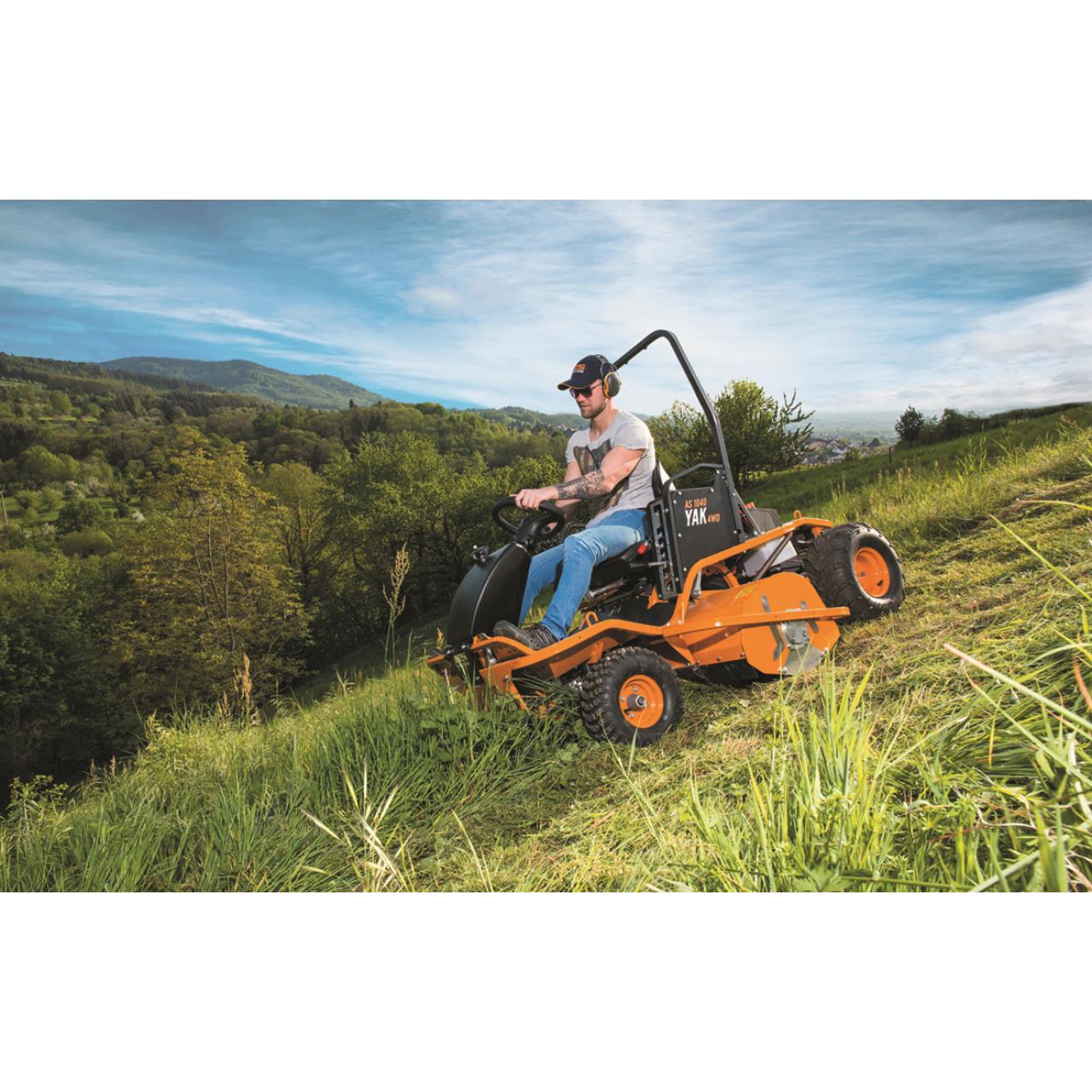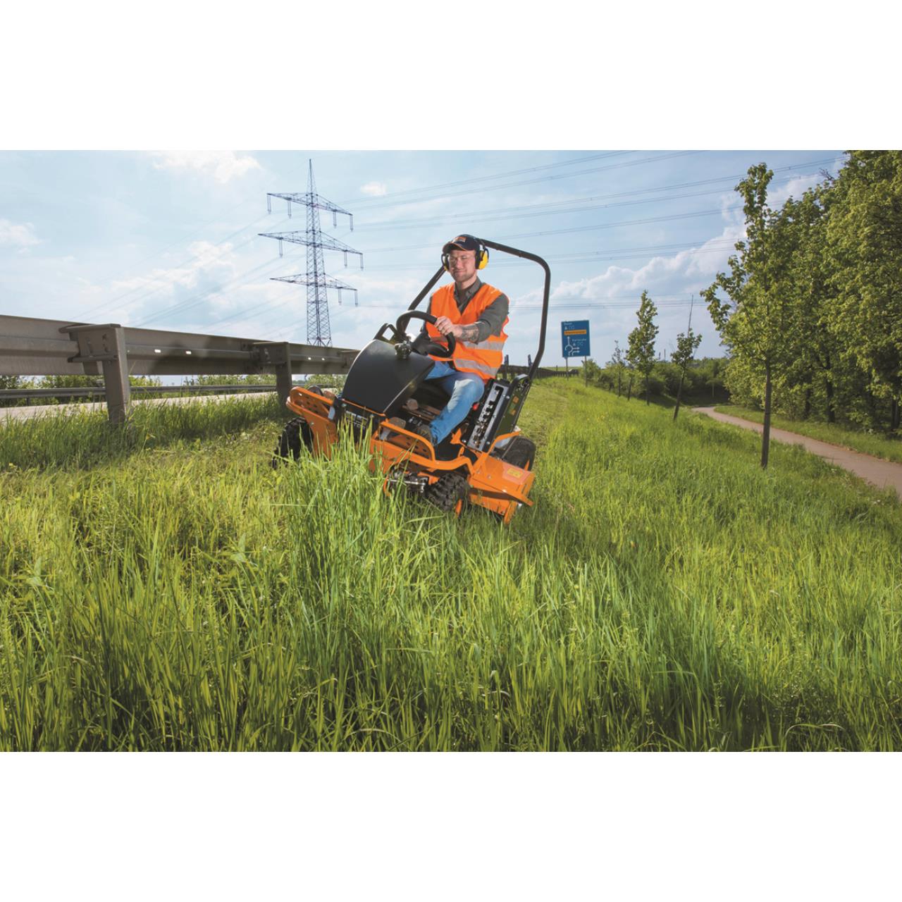 Der niedrige Schwerpunkt und die von AS-Aufsitzmähern gewohnt optimale Gewichtsverteilung prädestinieren den AS 1040 Yak 4WD für den Einsatz im steilen Gelände. Beste Traktion erhält er unter anderem durch den permanenten Allradantrieb und die Profibereifung/ die pendelnd gelagerte Vorderachse sorgt für durchgehenden Bodenkontakt. Das robuste Schlegelmähwerk kommt mit Bewuchs bis zu einer Höhe von 150 Zentimetern klar und zerkleinert alles zuverlässig zu feinem Mulch. Die 56 Y-Schlegel sind pendelnd aufgehängt. All diese Eigenschaften machen den AS 1040 YAK 4WD zum idealen Gerät für das Mähen von schwierigem Gelände wie beispielsweise Straßenböschungen. Sie sind oft stark abschüssig und werden nur wenige Male im Jahr gemäht/ entsprechend zäh und dicht ist dort der Bewuchs. Darüber hinaus muss hier immer mit unsichtbaren Hindernissen gerechnet werden, denen einerseits die Schlegel selbst, aber auch das surfende Mähdeck insgesamt ausweichen können, sodass Schäden am Mähwerk vermieden werden. Das seitlich versetzte Mähdeck erleichtert das Mähen unter Leitplanken, entlang von Straßenbegrenzungspfosten und Ähnlichem.